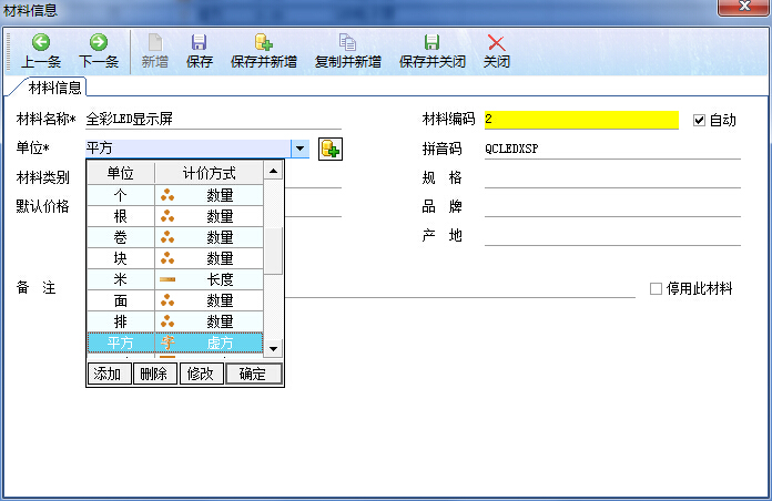 而在我們的廣告公司財(cái)務(wù)軟件中,材料的計(jì)價(jià)方式主要有4種:按面積計(jì)價(jià)、按長(zhǎng)度計(jì)價(jià)、按數(shù)量計(jì)價(jià)、按周長(zhǎng)計(jì)價(jià),以及現(xiàn)在的LED行業(yè)按照虛方計(jì)價(jià)的。如下圖所示: