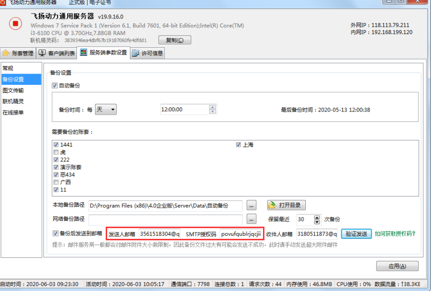 為了避免客戶因硬盤損壞或者重裝系統(tǒng),格式化所有磁盤,造成主機電腦所有數據丟失的情況,飛揚動力廣告公司管理軟件新增郵箱備份功能??蛻艨梢栽O置好郵件備份,軟件每天都把備份數據發(fā)送到你們自己的郵箱,即使主機電腦造成不可恢復的數據丟失,也可以通過郵箱備份的數據進行恢復,讓數據安全更有保障。那么如何將賬套數據備份到郵箱呢?具體操作步驟如下: