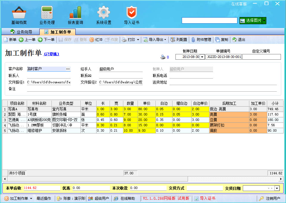 與日常使用的訂單完全吻合,適用于廣告制作各細(xì)分行業(yè),制單簡潔快速,直接拖拽圖片即可完成一筆業(yè)務(wù)錄入,并且自動分析圖片尺寸、用料、價格跟蹤及自動計算小計等,所有操作僅需一步拖拽動作。